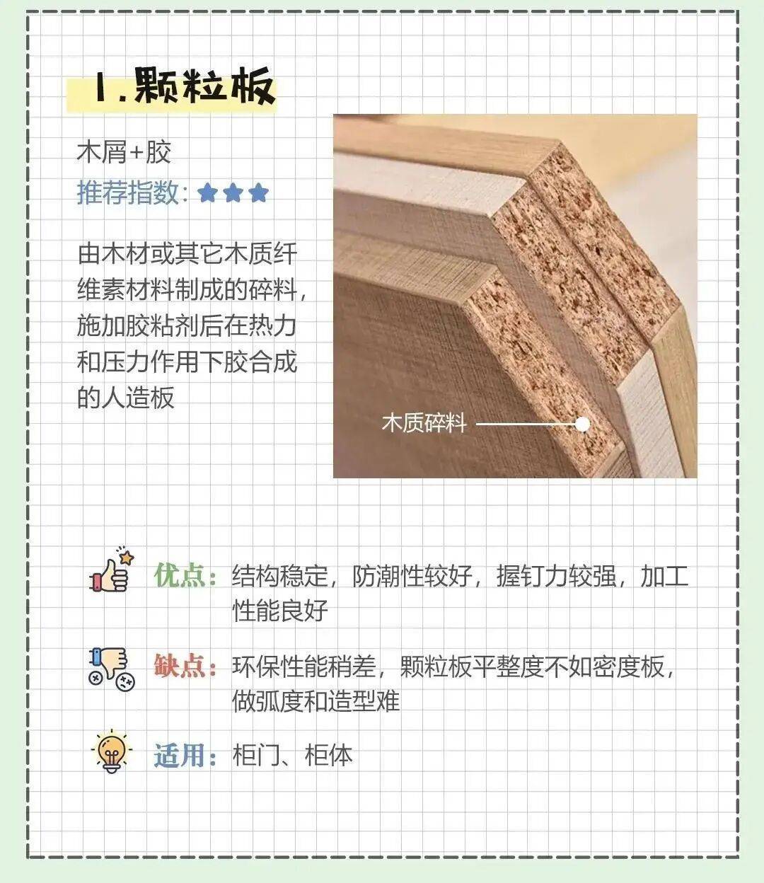 除此之外,颗粒板就是大量的碎屑和胶水粘合而成的,甲醛含量较多,环保性能相对较差,从这种角度来看,也不如实木材料。